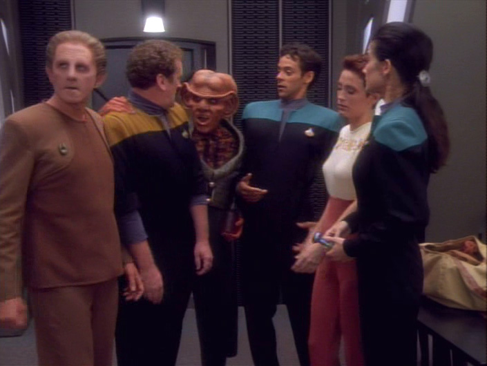 The next great scene is when almost the entire main cast comes to either wish the departing Kira well, or convince her to fight to stay on the station. It’s hilarious to watch Kira’s frustration build as people keep piling in to offer advice, support, or arguments, but it leads to some nice character moments. The tenderness beneath the surface that Odo and Kira feel for each other, the way Jadzia disses Julian’s “best” with, “That’s rather dull,” and the way the clearly overwhelmed Kira has to pause to admit to Vedek Bareil, and herself, that “these are my…these are my friends,” is very funny, but also very sweet. The closed off Kira we met at the beginning of the series could never have admitted such a thing.