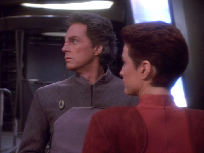 Sisko’s sparring with Minister Jaro is wonderful and really shows the alchemy that happens when you have two powerful actors together on screen. Watching Sisko clearly put Frank Langella’s creepy Minister Jaro in his place, in no uncertain terms, while never actually saying anything that could, on the surface, be construed as an insult that would put him in a diplomatically difficult position, is so much fun. I could just watch an episode where these two stayed in Sisko’s office and had a passive/aggressive face off for 45 minutes.