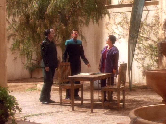 I really hate to type that sentence, but we see a nasty side to O’Brien in this episode. He’s made it no secret that he saw the atrocities committed by Cardassians during the war and that he believes the entire race to be violent butchers. Still, it is surprising that he cannot give the young Cardassian, Rugal, who has been raised by Bajorans and who currently wears a Bajoran earring, the benefit of the doubt. He is appalled that Keiko allowed Rugal to play with their daughter. In this instance, when Keiko puts Miles in his place, I didn’t find her attitude objectionable, but voicing my own thoughts. Despite their moment of connection when both push away the Cardassian dish Keiko chose to replicate, he barely hides his disdain for Cardassians, even when counselling the boy about the choice he faces. However, O’Brien redeems himself by the end as he offers Rugal his home anytime he would like to visit.