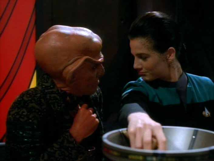 What a perfect opening sequence! The establishing shot is Morn asleep on the Promenade and when he’s awakened, he tries to enter Quark’s bar, which is closed. The camera takes us inside where a group of Ferengi are busy in a hot game of tongo—Confront, Evade, Acquire, Retreat! Of course, Jadzia Dax is there and wins, again. “Does she ever lose?” Rom asks with exasperation. Dax says a previous host learned the game, but he was never any good at it. Yet, Rom still tries to say that they aren’t losing to a female. There are several misogynistic jabs ending with the declaration that females should be “naked and submissive.” When Jadzia asks Quark if that is truly how he wants his women, he says, “I do. I really do!” with such lasciviousness there is no doubt what he is thinking.