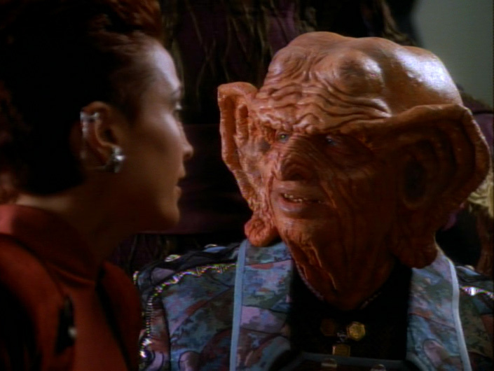 As if to highlight the gender politics of the episode, the Dosi representatives are male and female, both equally disagreeable in their negotiating demeanor. Pel is correct that Zek has set them up for failure with the Dosi. Pel and Quark pursue them into the Gamma Quadrant where Pel will encourage Quark beyond his own comfort level. Quark is always more concerned about his life and would not have pushed the Dosi, who he knows don’t hesitate to shoot to end negotiations. Yet, he remains persistent: he taps the male Dosi on the shoulder three times to demand attention and then tosses a barrel of wine. This impressed the female Dosi who privately explains to them that Inglatu isn’t being a tough negotiator, but rather that he cannot fulfill the demands for one hundred thousand vats of tulaberry wine. She tells them that she may be able to put them in contact with the Karemma, an important power in the Dominion. [There wasn’t a heavy bass note of thunder on her announcement, but I felt it. The first mention of the Dominion!]