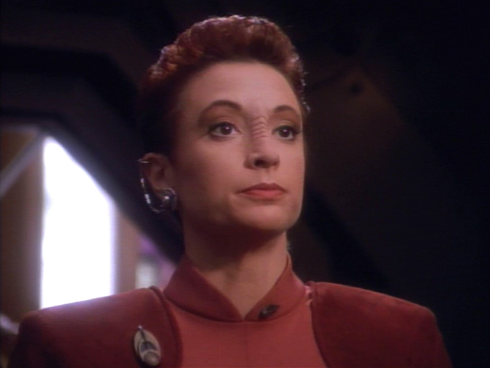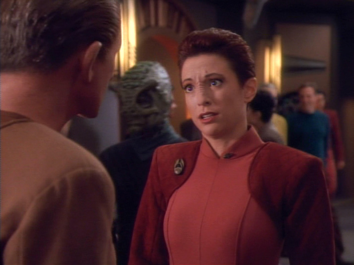 As soon as Kira hears that Quark broke into the Chemist’s Shop, she connects it to Vaatrik’s murder. She asks Odo if he wants to discuss it, because they haven’t. He curtly dismisses her offer because he found her innocent then and wants to leave her innocent. We are not surprised when the episode later reveals that Kira was indeed guilty (the “necessary evil” of the title). We are even less surprised by their stoic exchange that bubbles with the undercurrent of emotion.