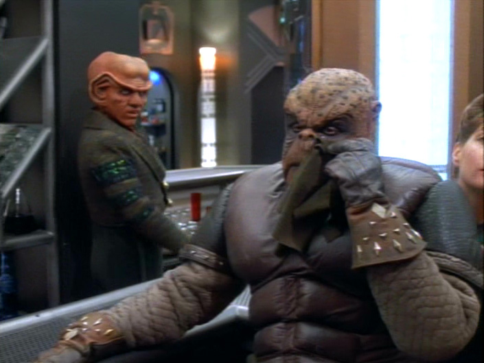 The Vulcan saying “Infinite Diversity in Infinite Combinations” is often trotted out in Trek, but here we see that not all species are so enlightened. The Ferengi are particularly unaccepting of the Skrreea, who “look and touch and don’t buy” and whose skin seems to leave flakes behind (I did keep thinking their skin looked like chunky oatmeal!). Nog’s teasing of them leads to Tumak, one of the original refugees, declaring that they are not wanted on the station and they do not want to be among those on the station.