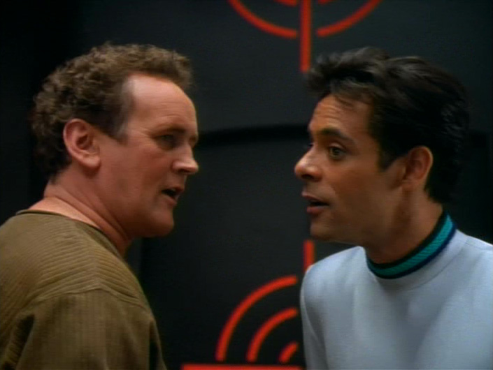 While Martus is busy unwisely using his little “lucky” gambling gizmo to beat Quark at his own game, Chief O’Brien, the most important person in the history of Starfleet, finds his newly built racquetball court invaded by Doctor Bashir…in a stunning silver onesie. I mean, he pulls it off with style and élan, but it’s quite a sight to behold. OF COURSE, it’s just O’Brien’s luck that Bashir not only plays racquetball, and that he was the captain of his medical school team. Despite lowering himself to play by O’Brien’s “old style” rules, Bashir thrashes the Chief, literally to within an inch of his life. He defeats him so badly, and so many times, that he is actually concerned he might cause Miles to have a heart attack right on the court. But O’Brien is not one to ever give up on a challenge and he just can’t let Julian win. I absolutely LOVE his sweaty fury. And, if Julian’s sexy athletic wear wasn’t quite your thing, there is plenty of shirtless O’Brien for everyone to enjoy! Nicely played, DS9.