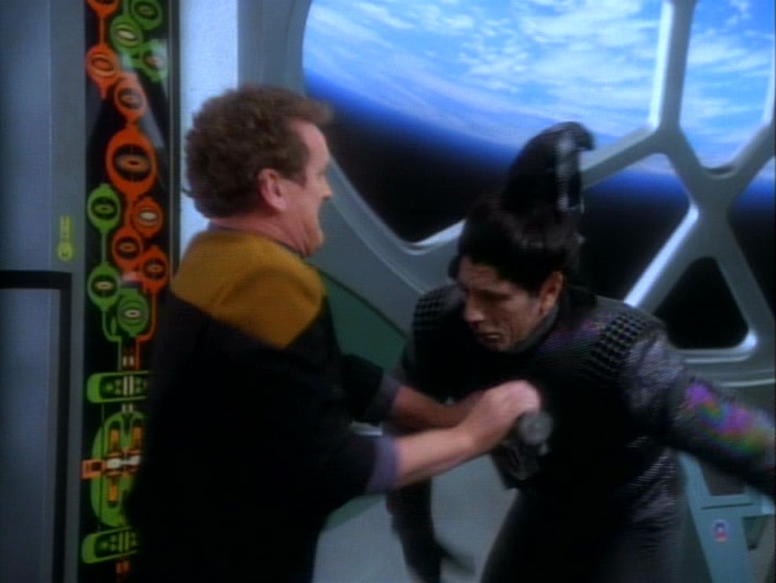 When things go wrong, which is inevitable the minute O’Brien says, “I suppose another day won’t kill me,” our heroes quickly switch gears to “action mode.” Bashir holds his own well enough, but I love how quickly mild-mannered Miles O’Brien goes into full-on soldier mode. It’s great writing that shows how much their Starfleet experiences have differed. O’Brien is a peaceful man who fixes things, but, as harmless as he may appear on the surface, he has an inner warrior that could go toe to toe with the most fierce Klingon. Our heroes quickly suss out the threat, beat down the Kellerun attackers, and find a way to escape, but the Kellerun and T’Lani ambassadors quickly head to DS9 to report their deaths and offer condolences. (Every time Sisko tries to sit down for a nice meal, Kira has to interrupt with terrible news about something that ruins his appetite. Could she be doing it on purpose? Not cool.)