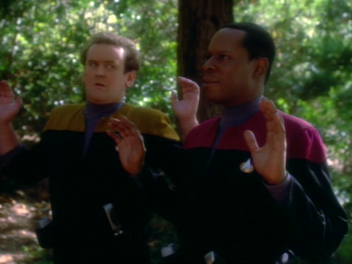 It must have been a slow week on the station, because Sisko and O’Brien are out and about looking for suitable planets to colonize. This seems like the kind of job that would usually be given to a couple of ensigns, so maybe they just needed a change of scenery. They come across a planet that has a mysterious bunch of humans on it, where no colony is supposed to exist. Curious, they beam down and discover a bunch of generally friendly colonists who crashed here 10 years ago. Mysteriously, no technology works here, so they’ve been stranded all this time. While most of the residents have questions about news from civilization, such as new ship designs, fashions, and soccer scores, their leader, Alixus, seems very keen on telling everyone how super-great it is to live without any technology in this swell paradise of constant labor, rationing, and infections. Fun times!