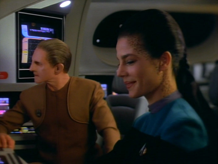 At least we know they return to their business of romance after Kira confronts the “troll” to let him know she cottoned on to his plot to “divert” her from her investigation of Quark’s cousin. Her saunter back to Bareil is classic Kira. Her reaching out to link arms with Bareil is softer than we are used to for Kira, but feels right.