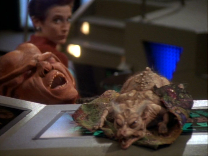 In the end, the universe is sent back home, where it will surely become someone else’s problem, and we can only assume that O’Brien rises to the Cardassian vole challenge. (They were ugly little suckers!) By the way, Quark’s shrieks when O’Brien tried out his wannabe Sonic Screwdriver are hilarious. Surely O’Brien had some inkling how it would affect those ears! And Jadzia Dax, wonderful, fun, cheeky, wise and fierce Jadzia Dax, successfully mentors Arjin without becoming Curzon. He even gets a kiss on the cheek! There are people who could die happy having achieved only that! Just people, I’m not thinking of anyone in particular. More Jadzia soon, please!