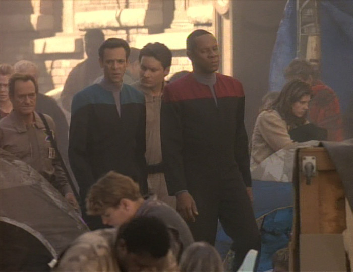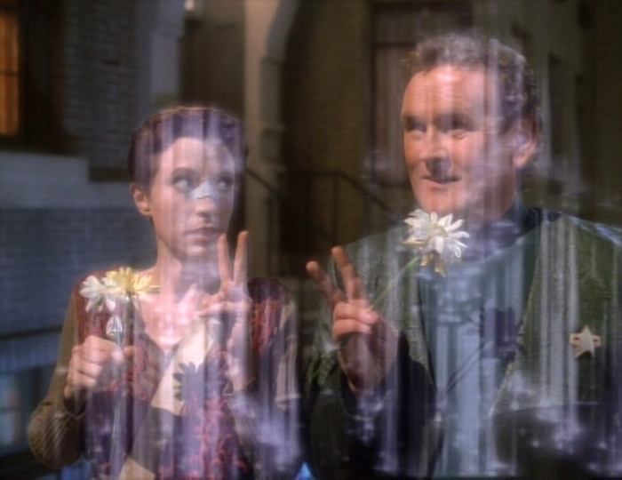 On the ship, O’Brien, Kira, and Odo must suss out what has happened–they competently determine that it was “chroniton” particles that displaced their crew in time. By the second episode, they begin figuring out how to use residual chroniton particles to make several jaunts to different time periods. While the Earthbound adventure is the meat of “Past Tense,” O’Brien and Kira popping into different, very recognizable eras of conflict, such as the pre-war eras of 1920s and 1940s, provides a bit of levity. When they land in the 1960s, they are so stunned by the gift of single daisies from a pair of hippies that they forget to hide before beaming out. Luckily, the hippies are probably high enough to chalk it up to a good trip. The shipboard story also provides the counterpoint showing that Sisko, Bashir, and Dax have changed the timeline when Federation Headquarters and all the communication arrays disappear. O’Brien conjectures that the residual chroniton particles have created a bubble around the ship that is protecting them from the changes.