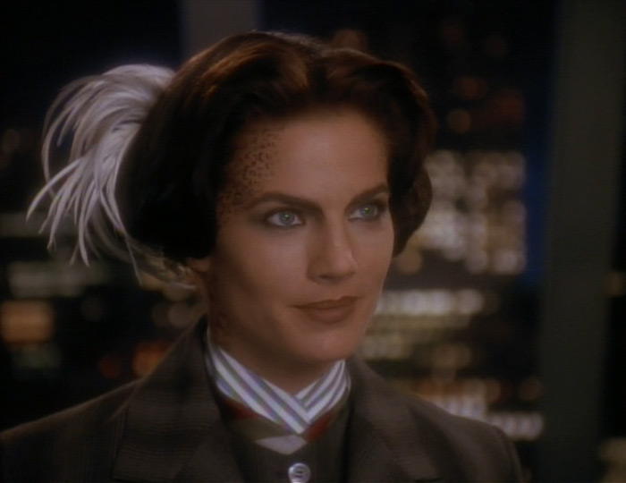 - Terry Farrell wearing the 1990s version of 2024 high fashion with a mini skirt, jacket with shoulder pads, and an up-do with a feather!