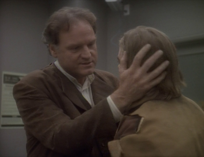 When the three beam down, they don’t arrive in San Francisco as expected. Well, they arrive in the proper location, but not the proper time period. On Earth, Sisko and Bashir are picked up by police and taken to a Sanctuary that seems the opposite of a place of refuge or safety. Meanwhile, Dax is taken in by a handsome, Ted Turner-esque businessman, Chris Brynner, played by Jim Metzler. The point of these two divergent paths cannot be mistaken–the brown men are treated with disdain, the white woman is treated with empathy.