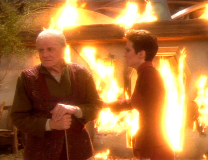 A lot more difficult than Kira anticipates, obviously. Mullibok has lived here for forty years. He tamed this land with his own hands, or even his own teeth if you believe his accounts of the struggles of his early days. As played by Brian Keith, Mullibok is a truly loveable curmudgeon. He is completely set in his ways, unwilling to change, and ready to die with his home. However, Kira absolutely can’t help but love him, so forcing him to give up his life is brutally painful for her. It also forces her to further come to terms with her changing sense of herself and who she really is. She’s used to being the underdog in opposition to “the man.” Her whole life has been about rebellion and fighting the powers that be, but now SHE is the power. She represents Bajor’s new government and has to force change on those who want to rebel for the overall good of Bajor. It certainly doesn’t help that the “right” thing to do is represented by an annoying bureaucrat and the one in the “wrong” is this man she instantly respects for all he has managed to achieve.