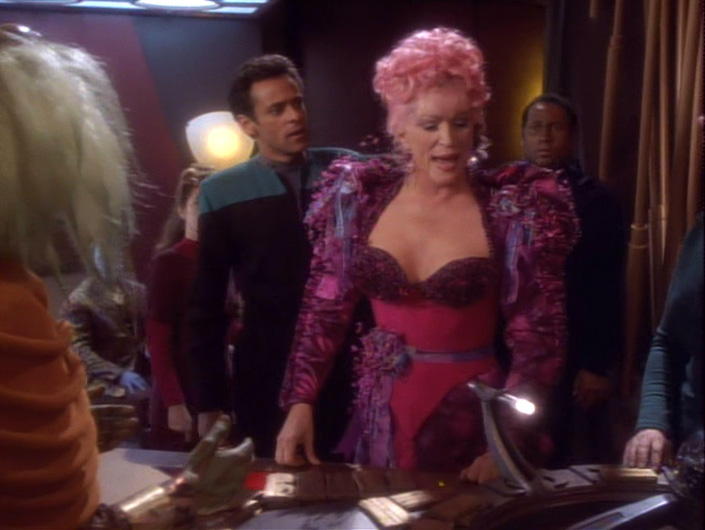 One thing that threw me off a little was that Odo ended up hanging out in Lwaxana’s dress when he returned to liquid rather than in her wig. One would think that since she just took off her wig, that it would have made a pretty good container for Odo … perhaps it was too small!