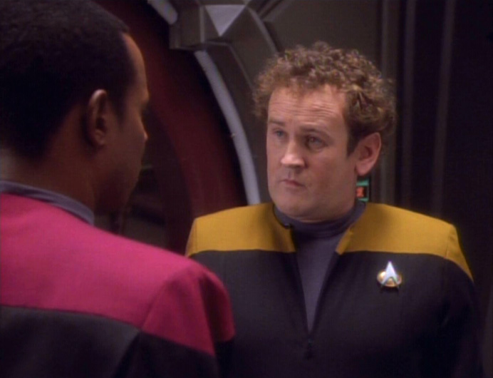 I love that “Q-Less” opens on Julian Bashir’s truly heroic telling of his epic, possibly deadly, travails through the utter Hell of…Starfleet Medical Exams. “That is the stuff salutatorians are made of.” If only he hadn’t mistaken a preganglionic fiber for a postganglionic nerve. (Remember this little detail new fans. It may have unexpected relevance years down the road!) Of course, the real highlight of this “Tale to Impress” is the truly awesome side-eye that O’Brien is shooting Bashir’s way throughout the telling. That look is priceless!